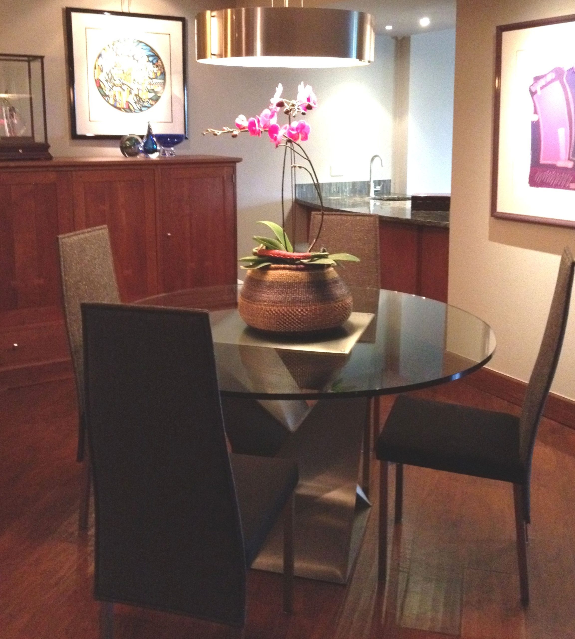• Glass tops generally do not get attached to the base.  Clear bumper pads are included with every order to use as a stabilizer for the glass and prevent it from sliding.